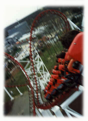 The Batwing on Great American Scream Machine. Dino Island is located in the gray building in the background.
